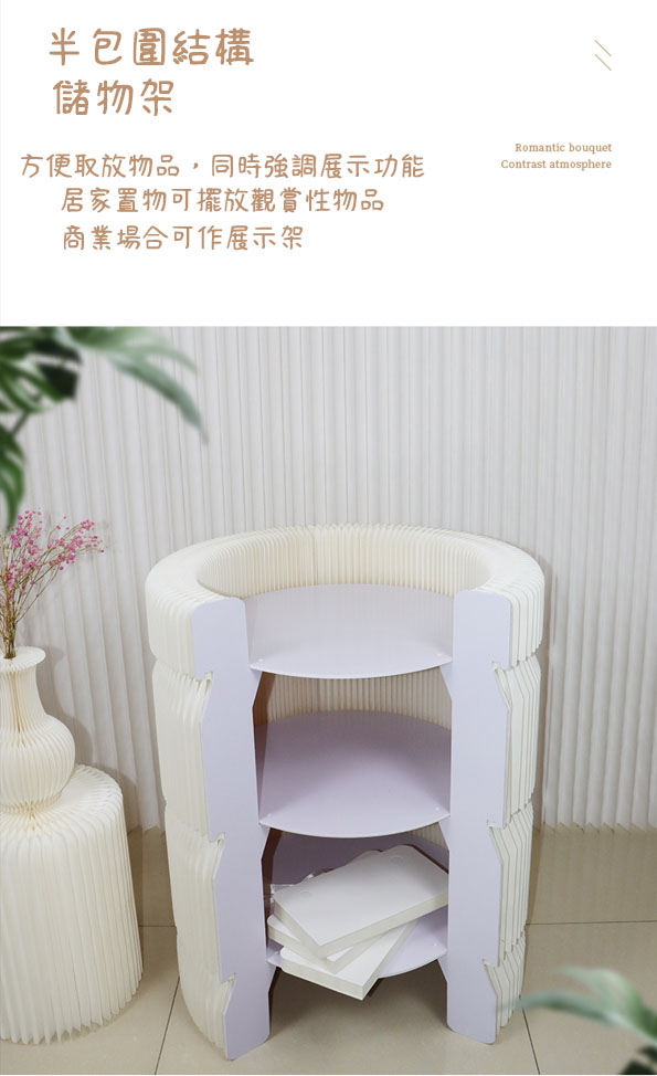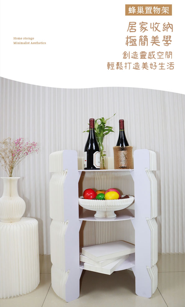 半包窩式置物架高質感簡約擺設,蜂窩力學結構承重,展架置物面積受力均衡,穩固耐用。易組裝,好收納,易搬運,又環保。
